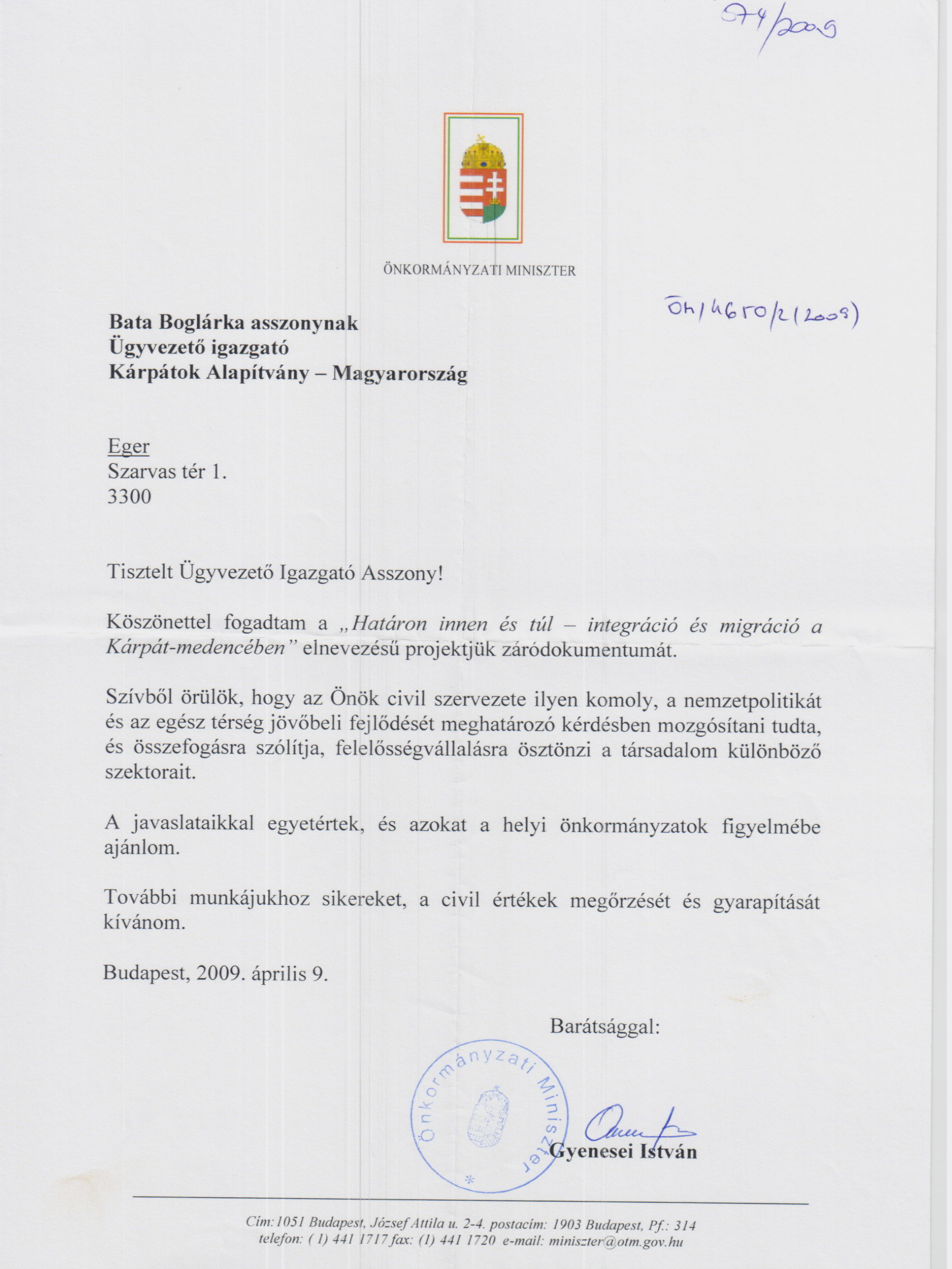 Dr. Gyenesei István, Önkormányzati Minisztérium válaszlevele.